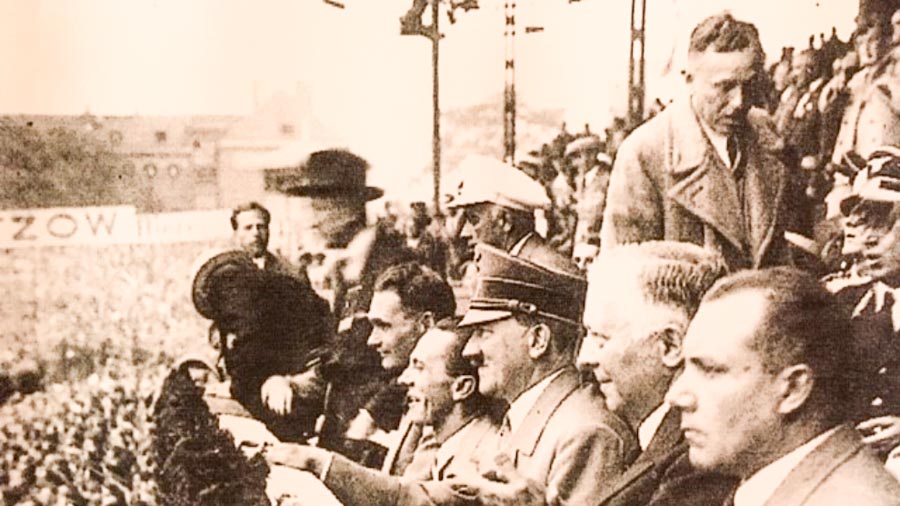 Adolf Hitler (center wearing military cap), Joseph Goebbels (to Hitler’s immediate right), and senior Nazi officials attending the quarter-final of the 1936 Olympic games in Berlin. They are watching Norway play Germany. Norway won 2-0 and Hitler stormed out of the stadium. Photo by anonymous (c. Summer 1936).