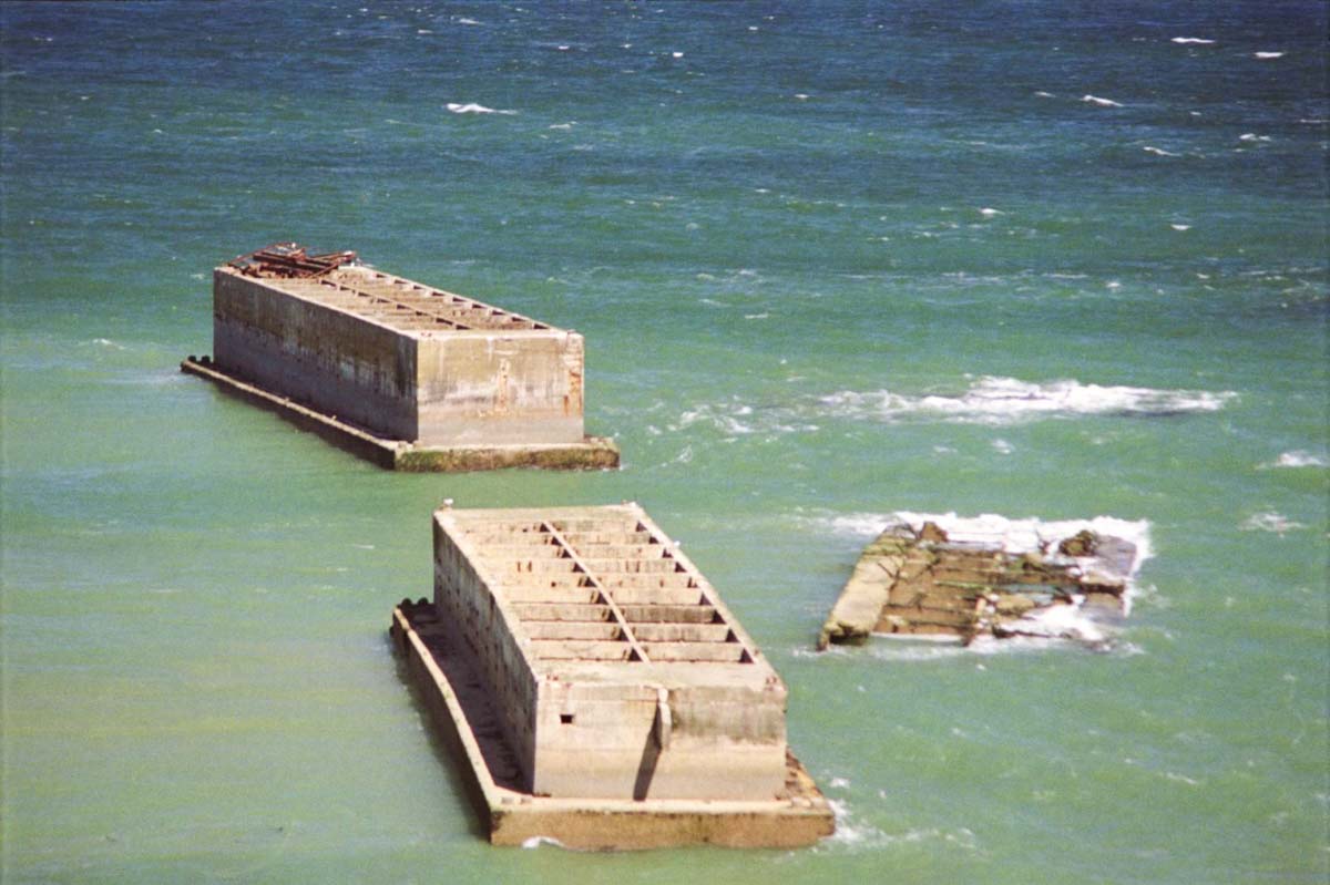 Several Phoenix caissons left at Arromanches. Photo by Joost J. Bakker (c. 2010). PD-CCA 2.0 Generic. Wikimedia Commons.