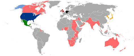 United States color-coded war plans. Black: Germany; Red: British Empire; Orange: Empire of Japan; Gold: France and its colonies; Crimson: Canada; Ruby: India; Scarlet: Australia; and Garnet: New Zealand. Illustration by Niklem (c. May 2013). PD-GNU Free Documentation License. Wikimedia Commons.
